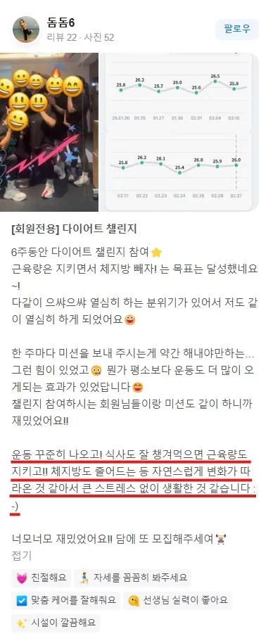 운동 꾸준히 나오고! 식사도 잘 챙겨먹으면 근육량도 지키고!! 체지방도 줄어드는 등 자연스럽게 변화가 따라온 것 같아서 큰 스트레스 없이 생활한 것 같습니다 :-)